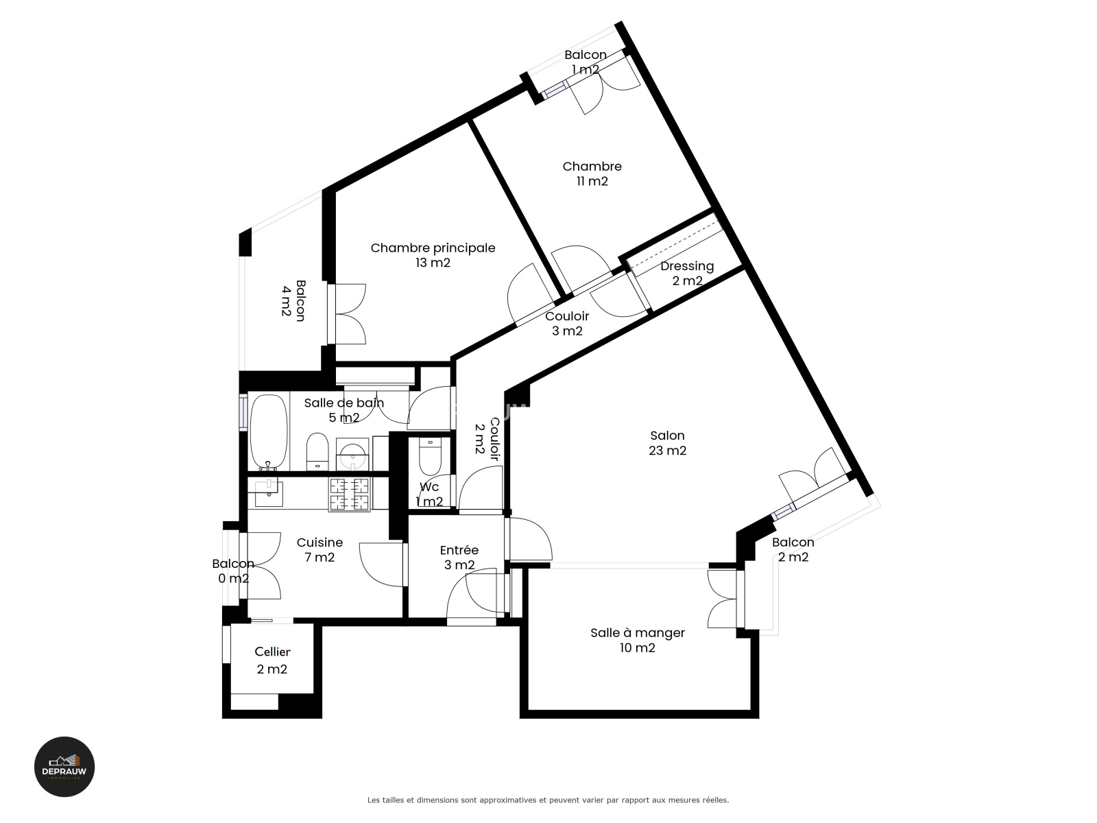 Il comprend : une entrée avec rangement, un séjour spacieux (33 m²), un balcon, une cuisine indépendante aménagée et un cellier attenant, deux chambres confortables dont une ouvrant sur une petite terrasse abritée, un dressing généreux, une salle de bains avec fenêtre, un wc séparé. En bonus : une belle cave de 10 m² en sous-sol.